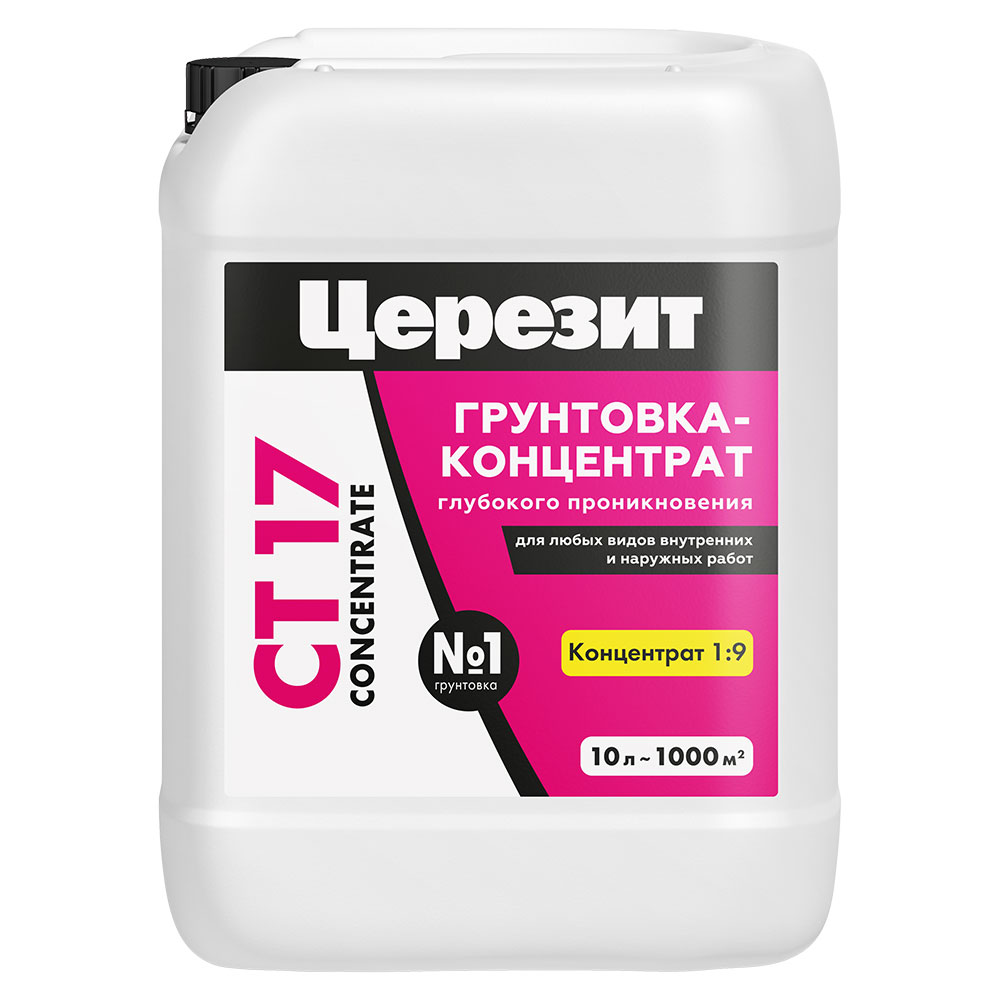 Грунтовка CT 17 Concentrate предназначена для обработки впитывающих, сильно впитывающих и непрочных оснований – бетона, цементных, известковых и гипсовых штукатурок, цементных, гипсовых и ангидритных стяжек, легкого и ячеистого бетона, кладок из керамического и силикатного кирпича, природного камня, древесностружечных и древесноволокнистых плит, гипсокартона и т.п. – перед нанесением выравнивающих штукатурных и напольных смесей, плиточных клеев, полимерных гидроизоляционных мастик, креплением систем теплоизоляции фасадов (СФТК) и т.д.