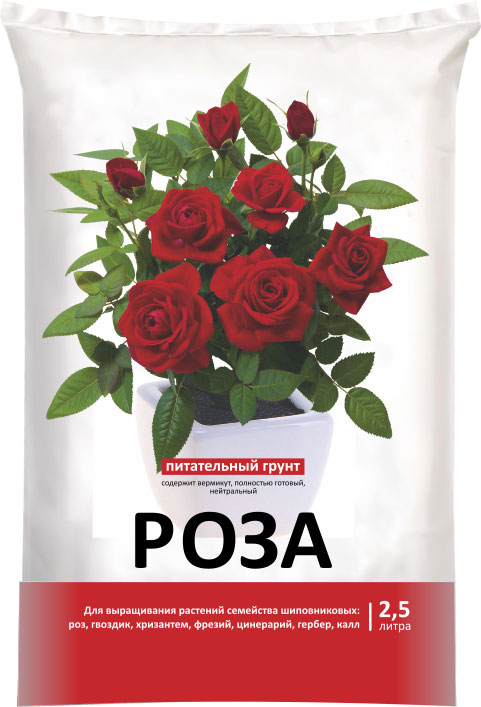 «РОЗА» — нейтральный питательный грунт, полностью готовый к применению для роз, хризантем, гвоздик, фрезий, гербер, цинерарий, калл.