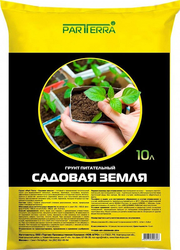 Садовый грунт Садовая земля 10л Нов-Агро.Готовый к применению питательный грунт для выращивания овощных, зелёных, зерновых, плодовых, ягодных, цветочных и декоративных культур в защищённом и открытом грунте. Используется в качестве заменителя дерновой земли для получения рассадного грунта, при основной заправке гряд, клумб, парников, посадке ягодных кустарников и плодовых деревьев.Состав: изготовлен на основе природных компоненто: торфа, естественных структурирующих раскисляющих и удобрительных материалов.Купить такой садовый грунт в Волгограде можно в нашем интернет-магазине по цене, указанной выше.