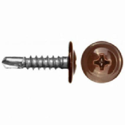 Саморез с пресс-шайбой, наконечник сверло. Саморезы с прессшайбой со сверлом окрашенные используются для соединения тонкого листового металла между собой. Саморез имеет резьбу с мелким шагом и наконечник со сверлом, что дает ему возможность просверливать металл до 2 мм. Чаще всего эти саморезы используют при монтаже заборов для крепления цветного металлического профиля к металлической обрешотки. Для закручивания данных саморезов используют насадки для шуруповертов. Если необходимо закрутить саморез в металл большей толщины, используется сверло по металлу 3,2-3,3 мм, для предварительного засверливания. Саморез с прессшайбой со сверлом окрашенный имеет плоскую головку с прессшайбой, окрашенную порошковой краской, крест ph-2, сверло на конце, покрытие цинк.