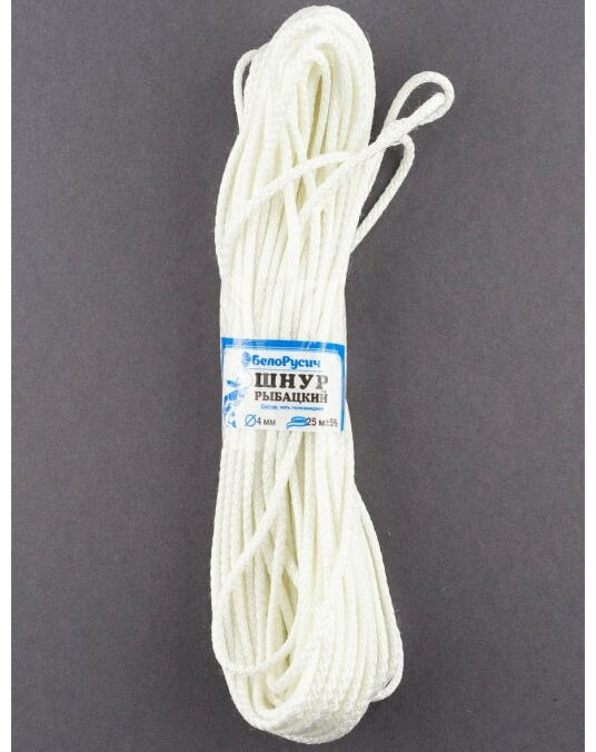 Шнур рыбацкий d=4 (25м) Шнур рыбацкий полиэфирный считается изделием, которое можно применять многократно. В отличие от своих собратьев – шпагатов и веревок, - шнур имеет повышенную прочность на разрыв, стоек к истиранию, долговечен, имеет отличный внешний вид.