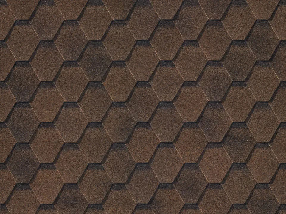 Черепица мягкая «Финская» коричневая (3 м2) изготавливается из стекловолокна, пропитанного окисленным битумом. Форма нарезки гонтов – «Соната». После монтажа черепица образует узор «Пчелиные соты»