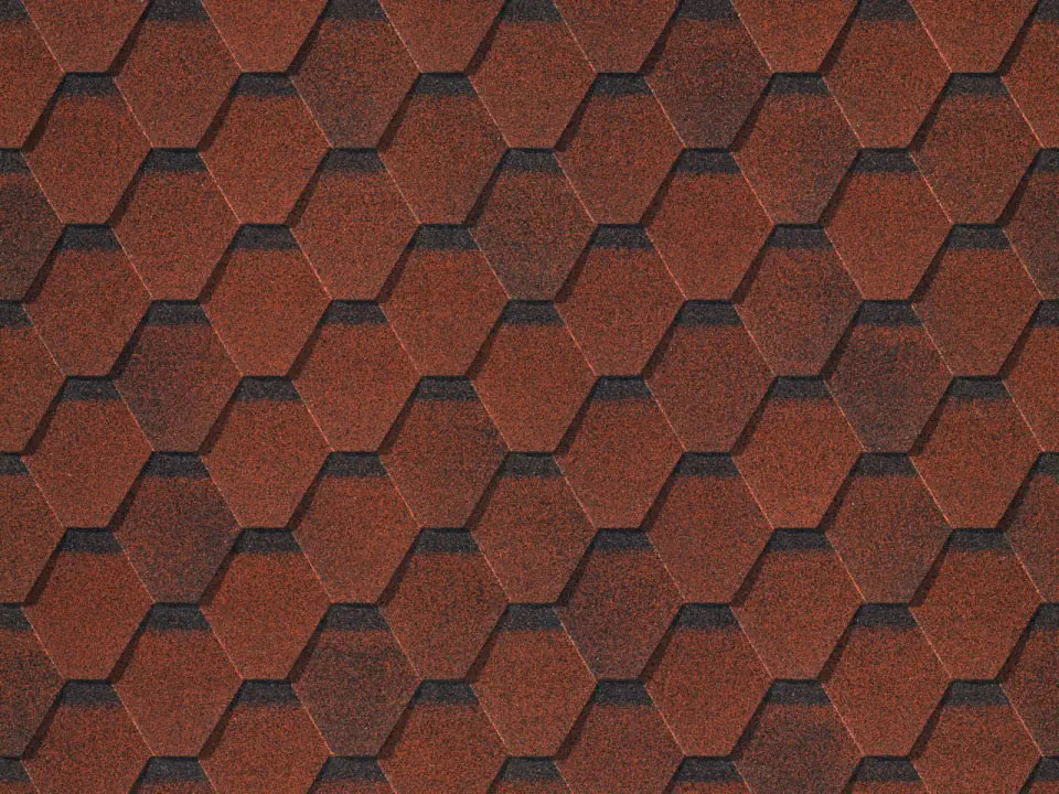 Черепица мягкая «Финская» красная (3 м2) изготавливается из стекловолокна, пропитанного окисленным битумом. Форма нарезки гонтов – «Соната». После монтажа черепица образует узор «Пчелиные соты»