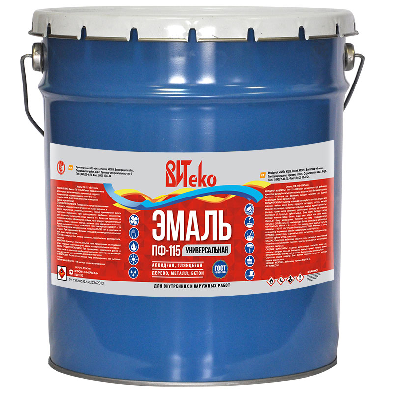 Эмаль белая матовая ПФ 115 ВИТЕКО 20 кг. НАЗНАЧЕНИЕ: для окраски металлических, деревянных и других поверхностей, подвергающихся атмосферным воздействиям, и для окраски внутри помещений (кроме окраски пола). СПОСОБ ПРИМЕНЕНИЯ: поверхность перед окрашиванием высушить, предварительно очистить от пыли, жировых и других загрязнений, ржавчины, окалины. Перед применением эмаль тщательно перемешать, при необходимости разбавить сольвентом, уайт-спиритом, скипидаром или их смесью 1:1. При окрашивании больших площадей рекомендуется использовать эмаль одной партии. СПОСОБ НАНЕСЕНИЯ: кистью, валиком или краскораспылителем. ВРЕМЯ ВЫСЫХАНИЯ каждого слоя эмали при температуре (20±2)°С – 24 часа. РАСХОД на однослойное покрытие 90-180 г/м2 в зависимости от цвета. СОСТАВ: алкидный лак, олифа, пигменты, наполнители, растворители, сиккатив. Купить данный товар Эмаль белая матовая ПФ 115 ВИТЕКО 20 кг можно в нашем интернет-магазине по цене, указанной выше.