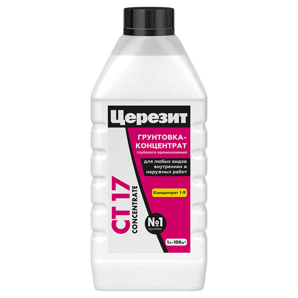 Грунтовка CT 17 Concentrate предназначена для обработки впитывающих, сильно впитывающих и непрочных оснований – бетона, цементных, известковых и гипсовых штукатурок, цементных, гипсовых и ангидритных стяжек, легкого и ячеистого бетона, кладок из керамического и силикатного кирпича, природного камня, древесностружечных и древесноволокнистых плит, гипсокартона и т.п. – перед нанесением выравнивающих штукатурных и напольных смесей, плиточных клеев, полимерных гидроизоляционных мастик, креплением систем теплоизоляции фасадов (СФТК) и т.д.