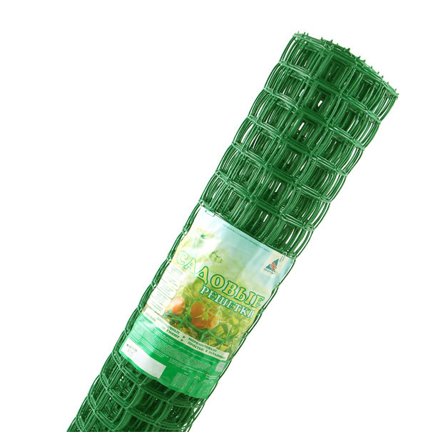Садовая решетка, размер ячейки 83х83 мм, высота рулона 1,0 м, длина рулона 20 м, цвет зеленый, из полиэтилена используется для поддержки растений или как ограждение для вольера.