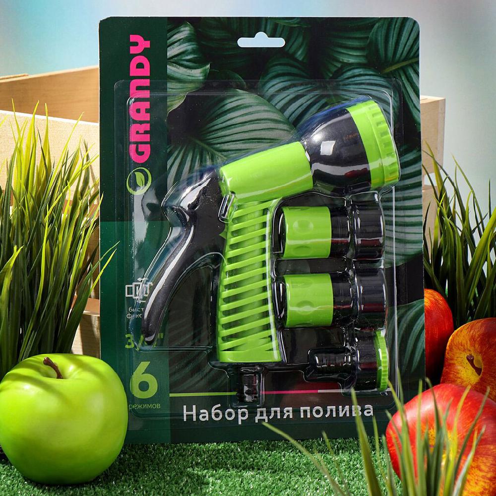 Набор для полива Grandy пистолет 6 режимов, фитинги 3/4", штуцеры на крана 1/2-3/4" нар. рез.JS-9366