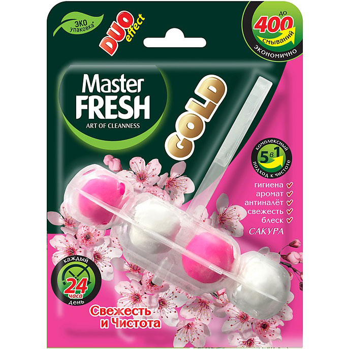 Подвесной блок для унитаза Master Fresh Duo effect Gold 5 в 1 обеспечивает гигиеническую чистоту, устраняет неприятные запахи, насыщает туалетную комнату приятным ароматом и свежестью океана до 400 смываний.