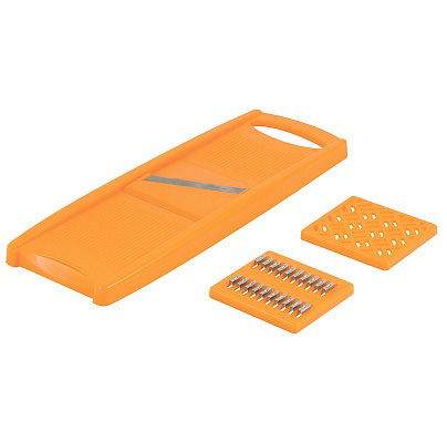 - слайсер с металлическими ножами-вставками. Используется для нарезки ломтиков и шинковки капусты;