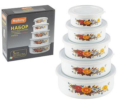 Набор из 5 эмалированных мисок с крышками, FAMILIA, 195/340/600/850/1250 мл, цвет: белый с дизайном