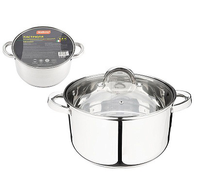 24*13,5 см размер, литраж 5,8 л, нержавеющая сталь, толщина - 0,4 мм, дно 3-слойное капсулированное - нерж сталь + 1 мм алюминия + сталь (толщина дна - 1,7 мм), подходит для индукции, снаружи и внутри - зеркальная полировка, полые ручки из нерж стали, С-тип крышка из жаропрочного стекла с отверстием для выпуска пара. Отметки литража. Упаковка - цветной картонный вкладыш, термоусадка (крышка в перевернутом виде внурь кастрюли).