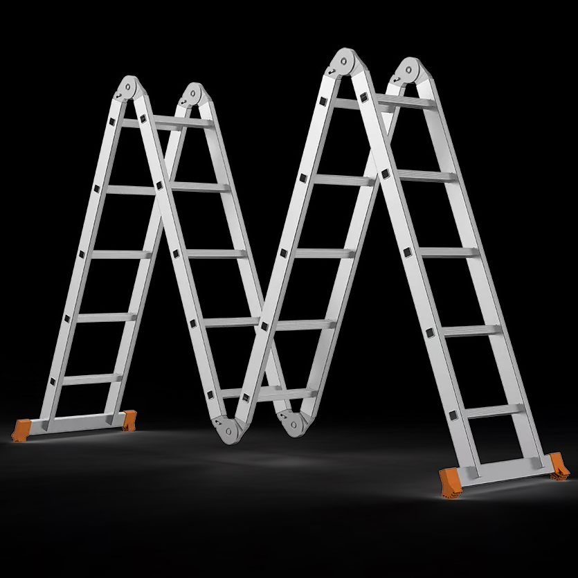 Многофункциональная лестница-трансформер из алюминия состоит из секций, соединенных плоскими шарнирами с автоматическими замками, изготовленными из прочной гальванизированной стали.