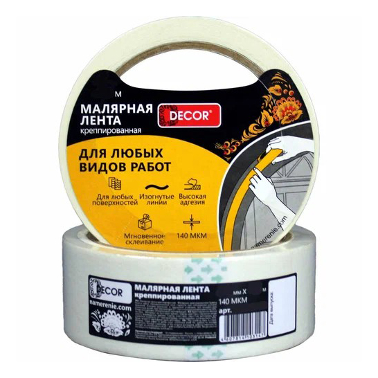 Удобная для применения малярная лента DECOR позволяет создавать изогнутые линии на поверхности. Не оставляет следов клея после удаления.