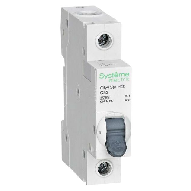 Автоматический выключатель серии City9 Set Systeme Electric, 1-полюсный, номинальный ток 32 А, характеристика С, Icn = 4.5 кА. Применяется в электрических сетях напряжением 230 В. Предназначен для защиты от перегрузок и токов короткого замыкания. Оснащен механизмом «мгновенной коммутации». Ударопрочный корпус из специального пластика с 6 металлическими заклепками. Безопасные клеммы исключают попадание кабелей в заклеммное пространство.