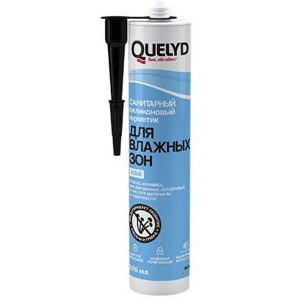 Quelyd «Санитарный силиконовый герметик ДЛЯ ВЛАЖНЫХ ЗОН» — однокомпонентный ацетатный силиконовый герметик. Отверждается за счет реакции с влагой воздуха.