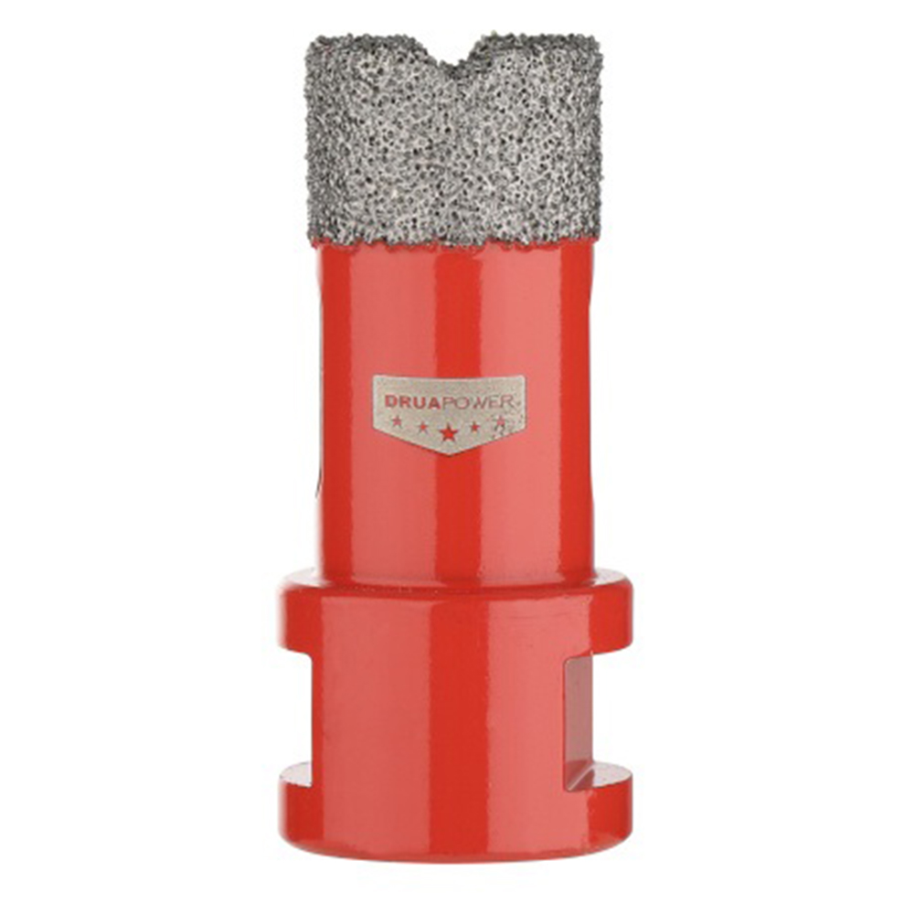 Алмазные коронки P.I.T. AMAS18 серии DRUA предназначены для сверления отверстий в керамограните, натуральном и искусственном камне, керамике, кирпиче и мраморе. Благодаря широкой алмазной кромке, выполненной по технологии вакуумного спекания алмазов, коронка имеет высокий ресурс и скорость сверления отверстий в материале. Хвостовик с внутренней резьбой M14 позволяет использовать коронки с угловыми шлифовальными машинами. Возможно использование коронок как для сухого, так и для мокрого сверления. Использование охлаждающей жидкости позволяет увеличить срок службы коронки и скорость работы.