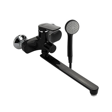 Смеситель для ванной/душевой комнаты из высокопрочного АБС-пластика, чёрного цвета, с длинным плоским изливом, литым корпусом, шаровый, с дивертором м/к на корпусе.