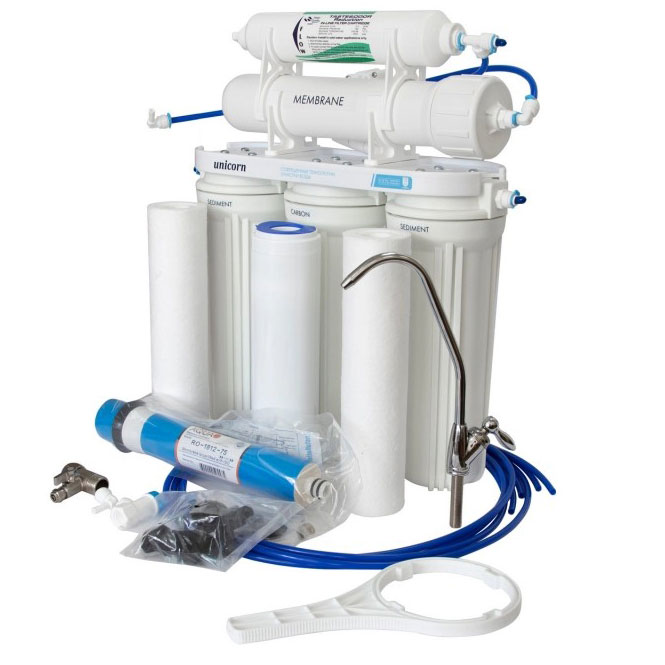 Обратноосмотическая мембрана. Устраняет до 96-99% загрязнений всех типов, в том числе бактерии и вирусы.