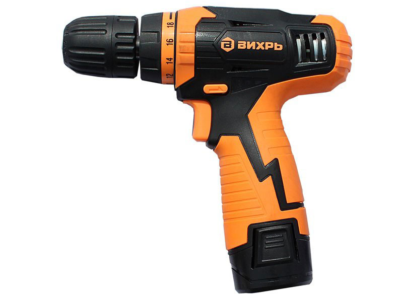 Аккумуляторный шуруповерт "Вихрь" ДА-12л-2к диаметр сверления 18/8 дерево/металл. Крутящий момент: 20 Н*м; Количество скоростей: двухскоростной; Число оборотов: 0 — 350 об/мин; Число оборотов (для 2 скорости): 1250 об/мин; Число ступеней крутящего момента: 18+1; Наличие функции «сверление»: есть; Тип основного патрона: быстрозажимной; Диаметр основного патрона: 0.8 — 10 мм; Максимальный диаметр сверления (сталь): 10 мм; Максимальный диаметр сверления (дерево): 20 мм; Тип электропитания: от аккумулятора; Тип аккумулятора: Li-Ion; Емкость аккумулятора: 1.3 Ач; Напряжение аккумулятора: 12 В; Запасная АКБ в комплекте: есть; Жесткий кейс в комплекте: есть; Вес: 1.3 кг.