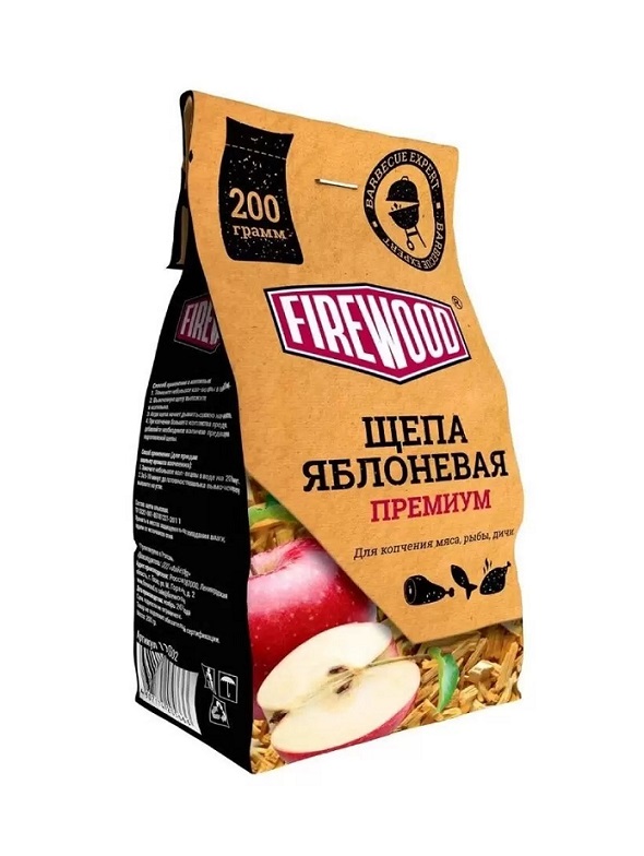 Щепа для копчения яблоневая под торговой маркой FireWood идеально подходит для копчения мяса и рыбы. При её производстве не используются пропитки, сырьём для изготовления служит древесина строго определённого возраста и географии произрастания. Равномерность измельчения, особый режим просушки и использование высококачественного сырья гарантируют прекрасный результат вне зависимости от типа коптильни.