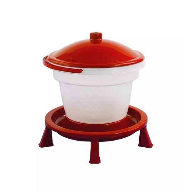 Круглый поддон с устойчивыми ножками. Полукруглая ручка бака для воды предназначена для переноса поилки или её подвешивания.
