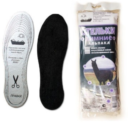 Стельки зимние "АЛЬПАКА" защитят ноги от холода. Состав стельки: овечья шерсть, искусственный войлок, металлизированный лавсан. Универсальный размер (вырезается по очерченному лекалу). Универсальные стельки предназначены для повышения комфорта и дополнительного утепления при эксплуатации любой обуви, в том числе рабочей. Стельки состоят из трех слоев: Нижний — металлизированный лавсан, придает стельке форму и служит экраном теплового излучения, что повышает теплоизолирующие свойства стельки. Второй слой — искусственный войлок, служит для повышения упругости стельки, для улучшения циркуляции воздуха и как дополнительный теплоизолирующий слой. Третий слой — овечья шерсть.